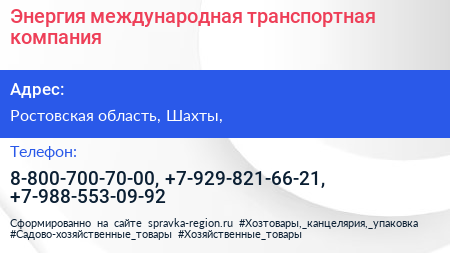 Энергия, международная транспортная компания по адресу Ростовская область, Шахты, в дальнейшем Организация, размещена в следующих категориях: