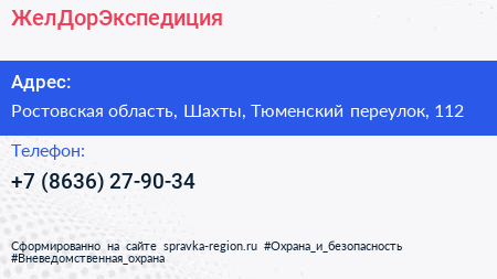 ЖелДорЭкспедиция по адресу Ростовская область, Шахты, Тюменский переулок, 112 в дальнейшем Организация, размещена в следующих категориях: