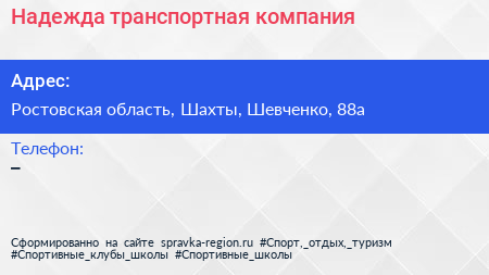 Надежда, транспортная компания по адресу Ростовская область, Шахты, Шевченко, 88а в дальнейшем Организация, размещена в следующих категориях: