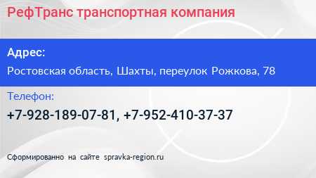 РефТранс, транспортная компания по адресу Ростовская область, Шахты, переулок Рожкова, 78 в дальнейшем Организация, размещена в следующих категориях: