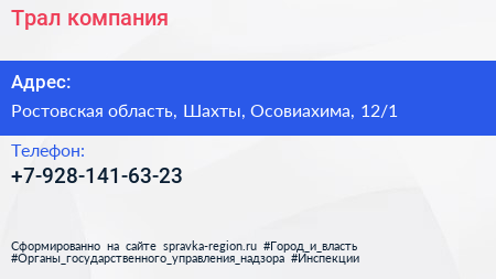 Трал, компания по адресу Ростовская область, Шахты, Осовиахима, 12/1 в дальнейшем Организация, размещена в следующих категориях: