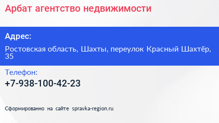 Арбат, агентство недвижимости по адресу Ростовская область, Шахты, переулок Красный Шахтёр, 35 в дальнейшем Организация, размещена в следующих категориях: