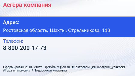 Асгера, компания по адресу Ростовская область, Шахты, Стрельникова, 113 в дальнейшем Организация, размещена в следующих категориях: