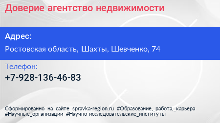 Доверие, агентство недвижимости по адресу Ростовская область, Шахты, Шевченко, 74 в дальнейшем Организация, размещена в следующих категориях: