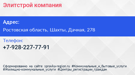 Элитстрой, компания по адресу Ростовская область, Шахты, Дачная, 278 в дальнейшем Организация, размещена в следующих категориях: