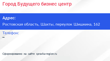 Город Будущего, бизнес-центр по адресу Ростовская область, Шахты, переулок Шишкина, 162 в дальнейшем Организация, размещена в следующих категориях: