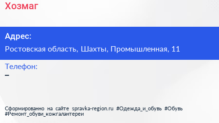 Хозмаг по адресу Ростовская область, Шахты, Промышленная, 11 в дальнейшем Организация, размещена в следующих категориях: