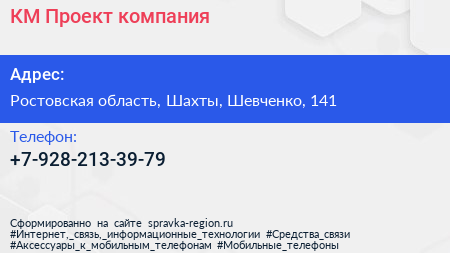 КМ Проект, компания по адресу Ростовская область, Шахты, Шевченко, 141 в дальнейшем Организация, размещена в следующих категориях: