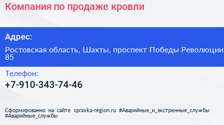 Компания по продаже кровли по адресу Ростовская область, Шахты, проспект Победы Революции, 85 в дальнейшем Организация, размещена в следующих категориях: