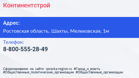 Континентстрой по адресу Ростовская область, Шахты, Мелиховская, 1м в дальнейшем Организация, размещена в следующих категориях: