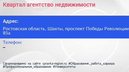 Квартал, агентство недвижимости по адресу Ростовская область, Шахты, проспект Победы Революции, 85а в дальнейшем Организация, размещена в следующих категориях: