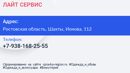 ЛАЙТ СЕРВИС по адресу Ростовская область, Шахты, Ионова, 112 в дальнейшем Организация, размещена в следующих категориях: