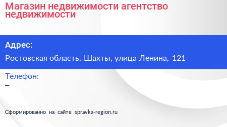 Магазин недвижимости, агентство недвижимости по адресу Ростовская область, Шахты, улица Ленина, 121 в дальнейшем Организация, размещена в следующих категориях: