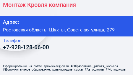 Монтаж-Кровля, компания по адресу Ростовская область, Шахты, Советская улица, 279 в дальнейшем Организация, размещена в следующих категориях: