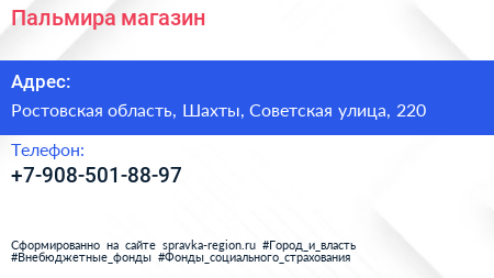 Пальмира, магазин по адресу Ростовская область, Шахты, Советская улица, 220 в дальнейшем Организация, размещена в следующих категориях: