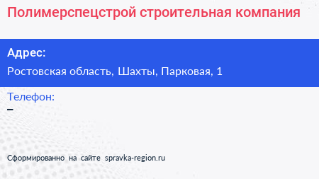 Полимерспецстрой, строительная компания по адресу Ростовская область, Шахты, Парковая, 1 в дальнейшем Организация, размещена в следующих категориях: