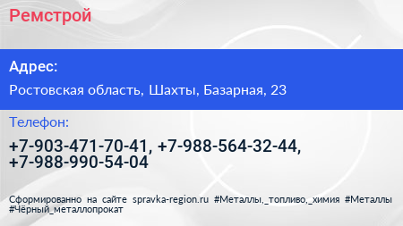 Ремстрой по адресу Ростовская область, Шахты, Базарная, 23 в дальнейшем Организация, размещена в следующих категориях: