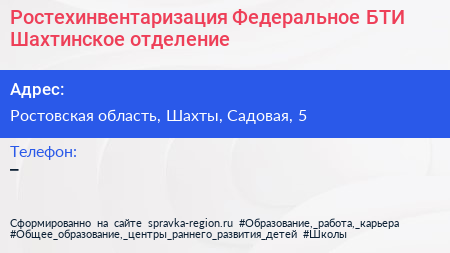 Ростехинвентаризация-Федеральное БТИ, Шахтинское отделение по адресу Ростовская область, Шахты, Садовая, 5 в дальнейшем Организация, размещена в следующих категориях: