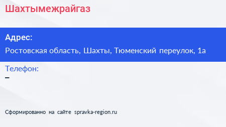 Шахтымежрайгаз по адресу Ростовская область, Шахты, Тюменский переулок, 1а в дальнейшем Организация, размещена в следующих категориях: