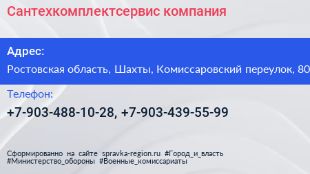 Сантехкомплектсервис, компания по адресу Ростовская область, Шахты, Комиссаровский переулок, 80 в дальнейшем Организация, размещена в следующих категориях:
