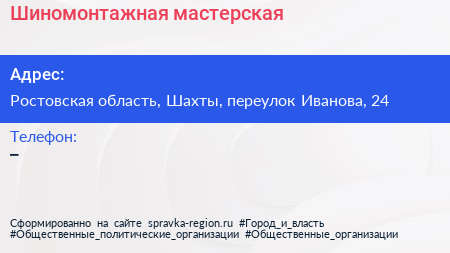 Шиномонтажная мастерская по адресу Ростовская область, Шахты, переулок Иванова, 24 в дальнейшем Организация, размещена в следующих категориях: