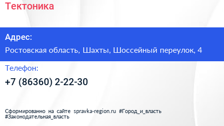 Тектоника по адресу Ростовская область, Шахты, Шоссейный переулок, 4 в дальнейшем Организация, размещена в следующих категориях: