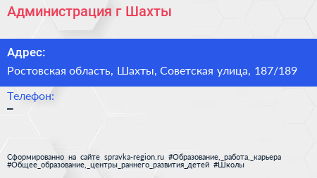 Администрация г. Шахты по адресу Ростовская область, Шахты, Советская улица, 187/189 в дальнейшем Организация, размещена в следующих категориях: