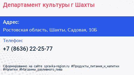 Департамент культуры г. Шахты по адресу Ростовская область, Шахты, Садовая, 10Б в дальнейшем Организация, размещена в следующих категориях:
