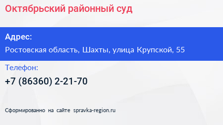 Октябрьский районный суд по адресу Ростовская область, Шахты, улица Крупской, 55 в дальнейшем Организация, размещена в следующих категориях: