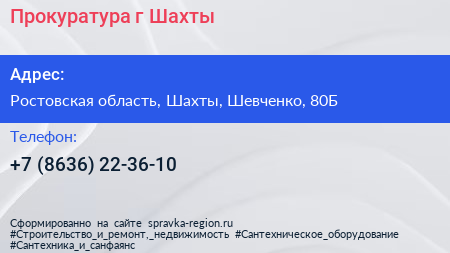 Прокуратура г. Шахты по адресу Ростовская область, Шахты, Шевченко, 80Б в дальнейшем Организация, размещена в следующих категориях: