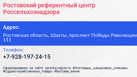 Ростовский референтный центр Россельхознадзора по адресу Ростовская область, Шахты, проспект Победы Революции, 111 в дальнейшем Организация, размещена в следующих категориях: