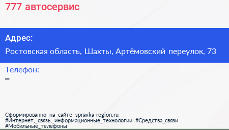 777, автосервис по адресу Ростовская область, Шахты, Артёмовский переулок, 73 в дальнейшем Организация, размещена в следующих категориях: