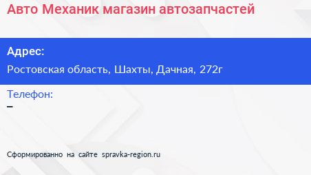 Авто Механик, магазин автозапчастей по адресу Ростовская область, Шахты, Дачная, 272г в дальнейшем Организация, размещена в следующих категориях: