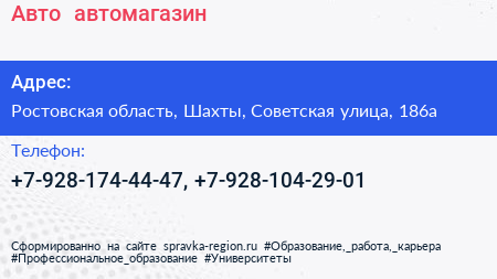 Авто+, автомагазин по адресу Ростовская область, Шахты, Советская улица, 186а в дальнейшем Организация, размещена в следующих категориях: