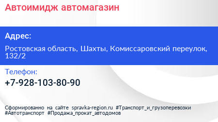 Автоимидж, автомагазин по адресу Ростовская область, Шахты, Комиссаровский переулок, 132/2 в дальнейшем Организация, размещена в следующих категориях: