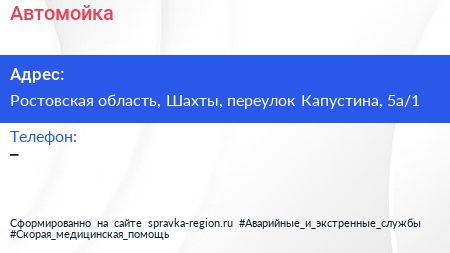 Автомойка по адресу Ростовская область, Шахты, переулок Капустина, 5а/1 в дальнейшем Организация, размещена в следующих категориях: