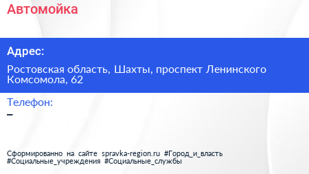 Автомойка по адресу Ростовская область, Шахты, проспект Ленинского Комсомола, 62 в дальнейшем Организация, размещена в следующих категориях: