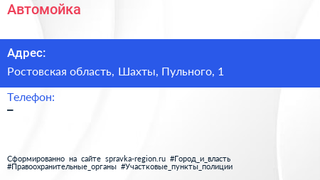Автомойка по адресу Ростовская область, Шахты, Пульного, 1 в дальнейшем Организация, размещена в следующих категориях: