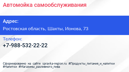Автомойка самообслуживания по адресу Ростовская область, Шахты, Ионова, 73 в дальнейшем Организация, размещена в следующих категориях: