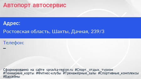 Автопорт, автосервис по адресу Ростовская область, Шахты, Дачная, 239/3 в дальнейшем Организация, размещена в следующих категориях: