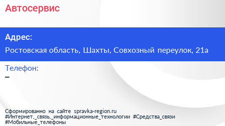 Автосервис по адресу Ростовская область, Шахты, Совхозный переулок, 21а в дальнейшем Организация, размещена в следующих категориях: