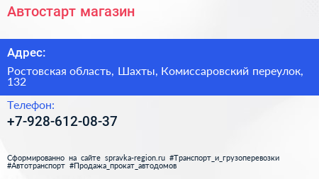 Автостарт, магазин по адресу Ростовская область, Шахты, Комиссаровский переулок, 132 в дальнейшем Организация, размещена в следующих категориях: