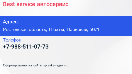 Best service, автосервис по адресу Ростовская область, Шахты, Парковая, 50/1 в дальнейшем Организация, размещена в следующих категориях: