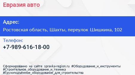 Евразия авто по адресу Ростовская область, Шахты, переулок Шишкина, 102 в дальнейшем Организация, размещена в следующих категориях: