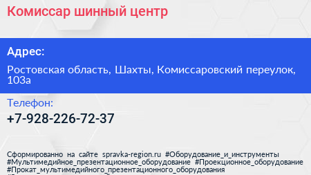 Комиссар, шинный центр по адресу Ростовская область, Шахты, Комиссаровский переулок, 103а в дальнейшем Организация, размещена в следующих категориях: