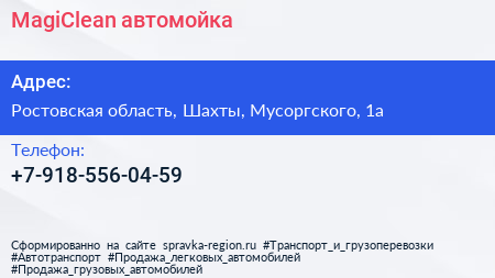 MagiClean, автомойка по адресу Ростовская область, Шахты, Мусоргского, 1а в дальнейшем Организация, размещена в следующих категориях:
