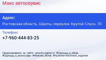 Макс, автосервис по адресу Ростовская область, Шахты, переулок Крутой Спуск, 70 в дальнейшем Организация, размещена в следующих категориях: