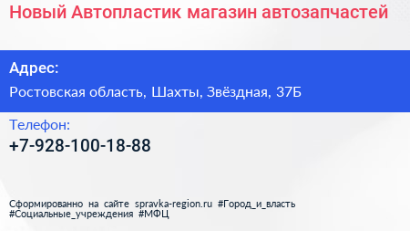 Новый Автопластик, магазин автозапчастей по адресу Ростовская область, Шахты, Звёздная, 37Б в дальнейшем Организация, размещена в следующих категориях: