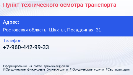 Пункт технического осмотра транспорта по адресу Ростовская область, Шахты, Посадочная, 31 в дальнейшем Организация, размещена в следующих категориях: