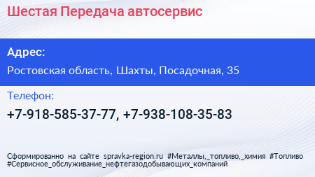 Шестая Передача, автосервис по адресу Ростовская область, Шахты, Посадочная, 35 в дальнейшем Организация, размещена в следующих категориях: